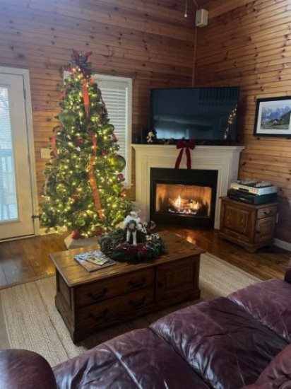 The main level boasts a fully-equipped kitchen, spacious great room with living room and dining area, and a porch with both open and screened-in areas. The kitchen is beautifully designed with new stainless steel appliances, granite countertops, subway tile backsplash, and a large island with a bar and built-in stove/range combo. The living room has an impressive wood vaulted ceiling, a gas fireplace to keep everyone toasty, and comfortable leather couches for the family to relax on. You can also easily access the deck for BBQing on the gas grill or relaxing in the hot tub under the string bulb lights